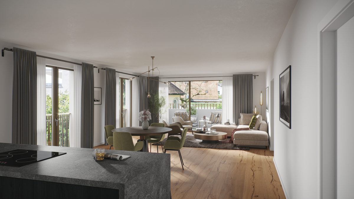 Die moderne Putzfassade und das begrünte Flachdach vereinen zeitlose Ästhetik mit nachhaltigem Bauen. Hier trifft innovative Architektur auf umweltbewusstes Design. Jede Wohnung ist ein Ausdruck von hochwertiger Handwerkskunst und durchdachter Planung – ein Ort, an dem Sie sofort spüren, dass es "Ihr" Zuhause ist. Die großzügigen Fensterflächen sorgen für lichtdurchflutete Räume, während die Fußbodenheizung eine behagliche Wärme verbreitet.