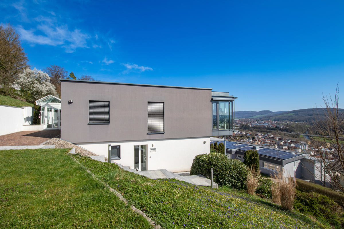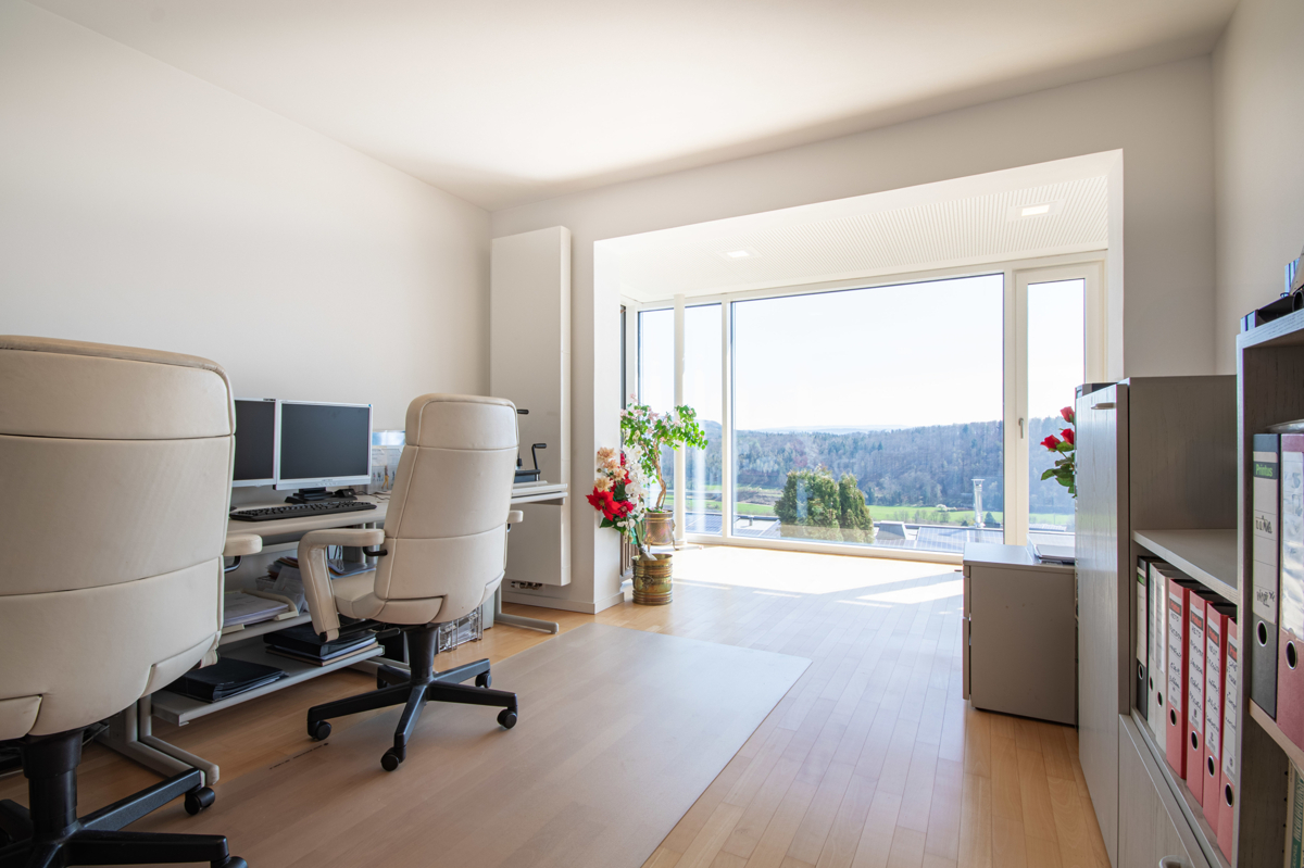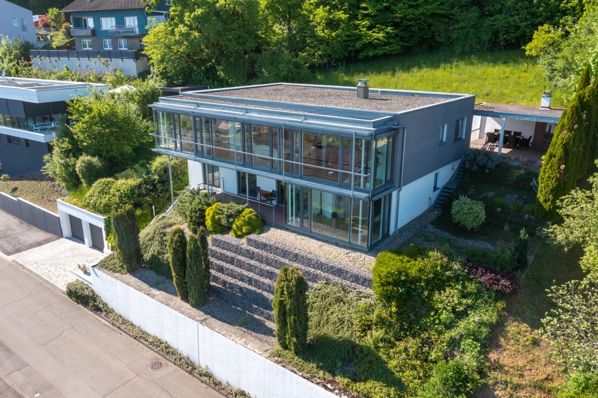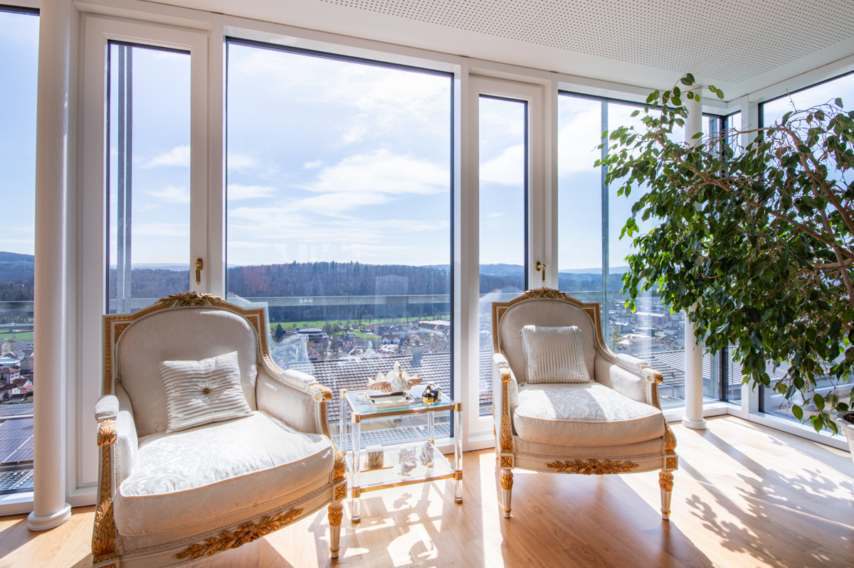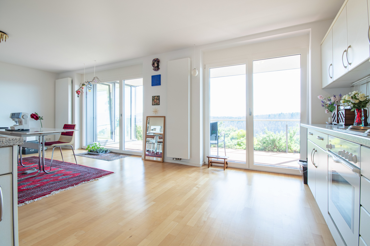 Die nachträgliche Erweiterung des ursprünglichen Grundrisses sowie der Einbau von bodentiefen Fenstern mit Dreifachverglasung sorgen für eine lichtdurchflutete Atmosphäre und eine außergewöhnliche Aussicht über Tiengen.