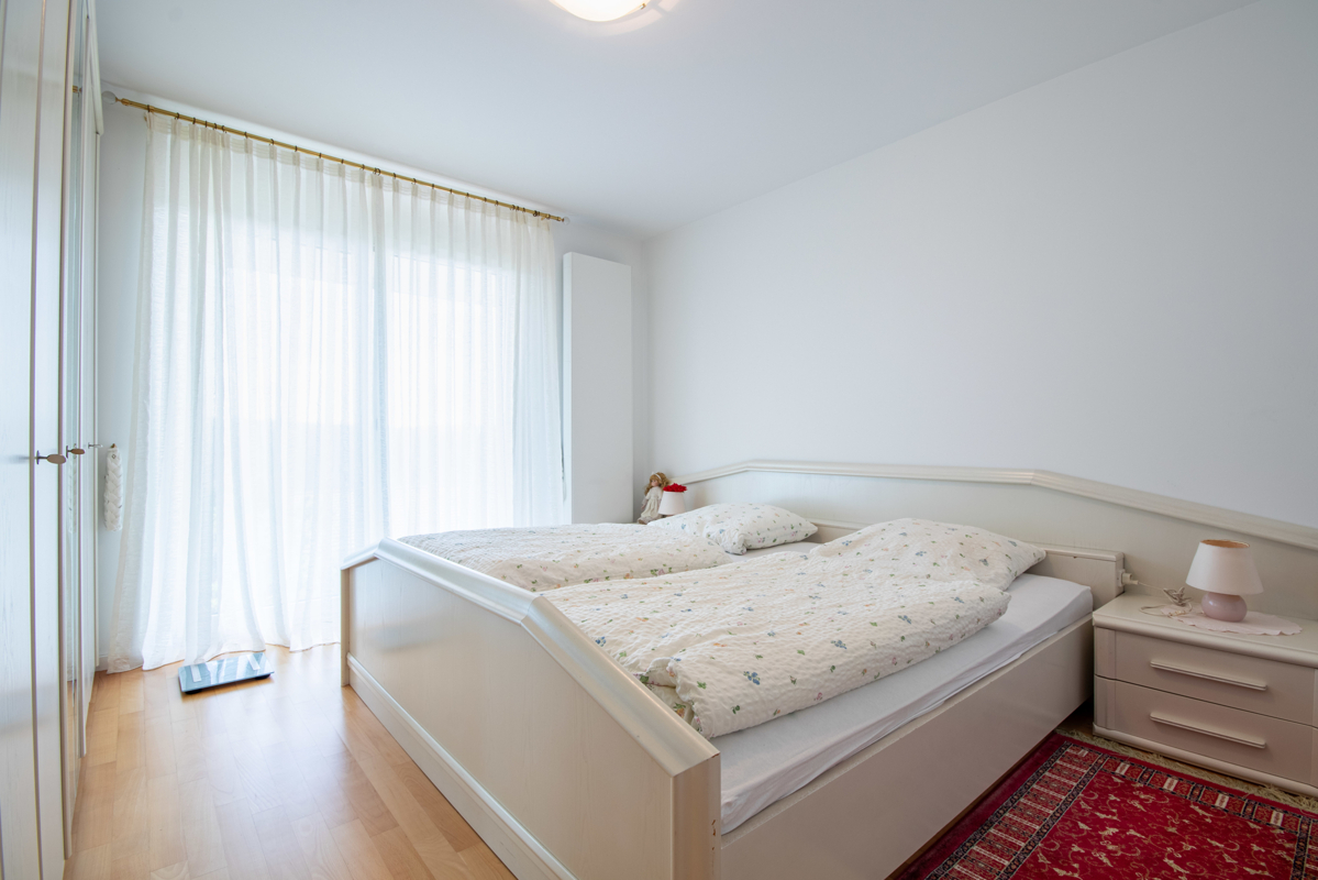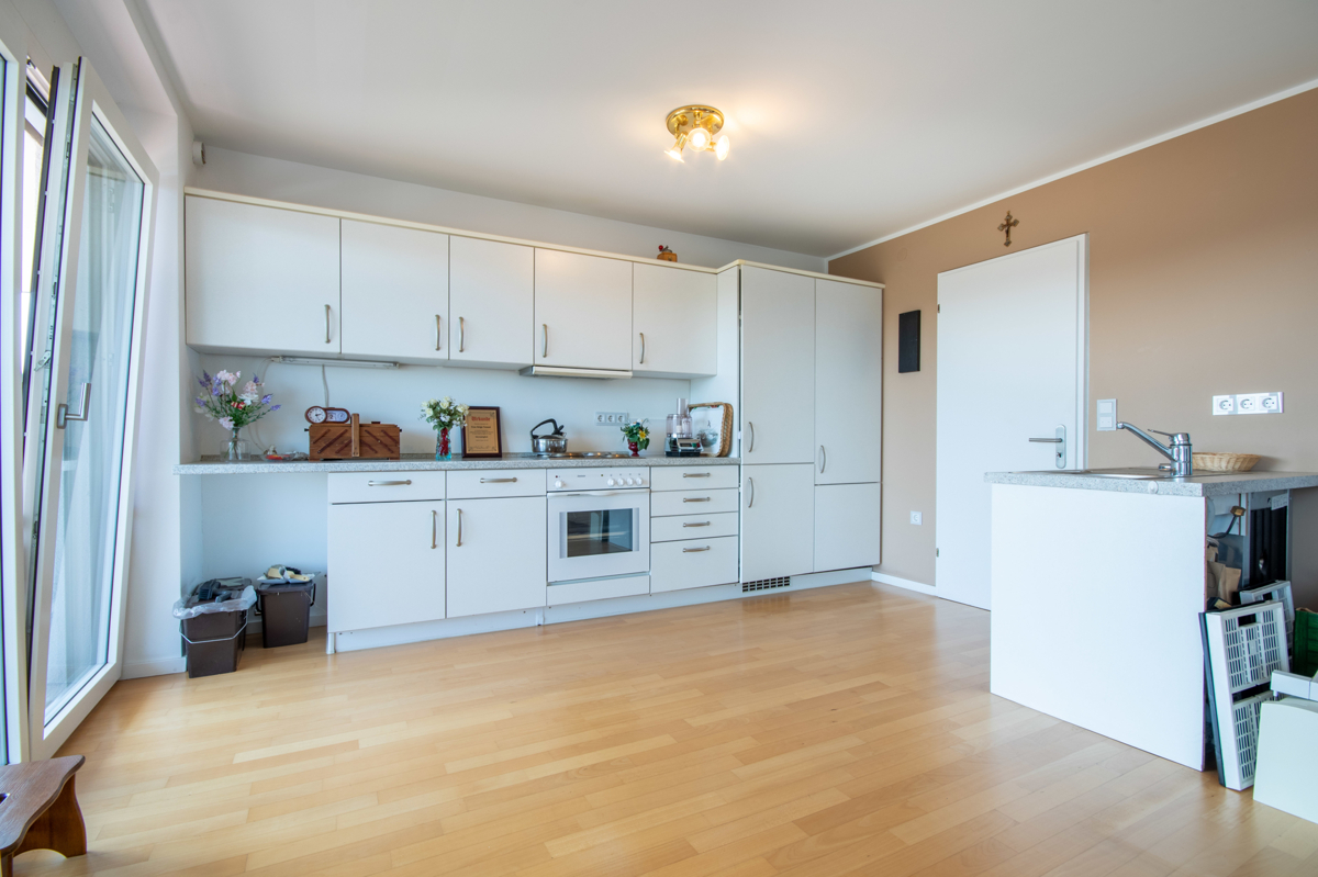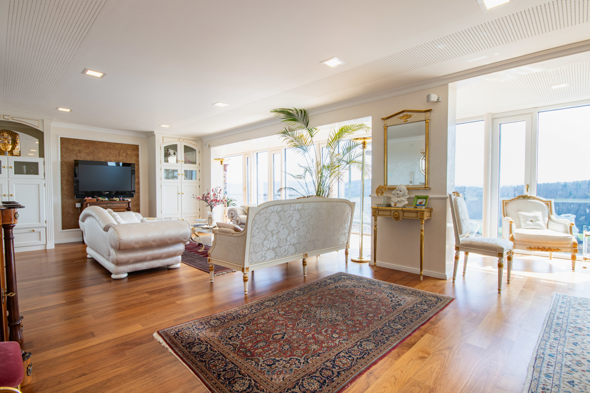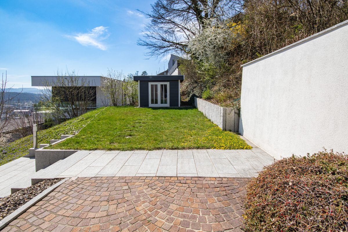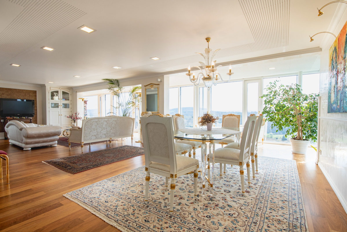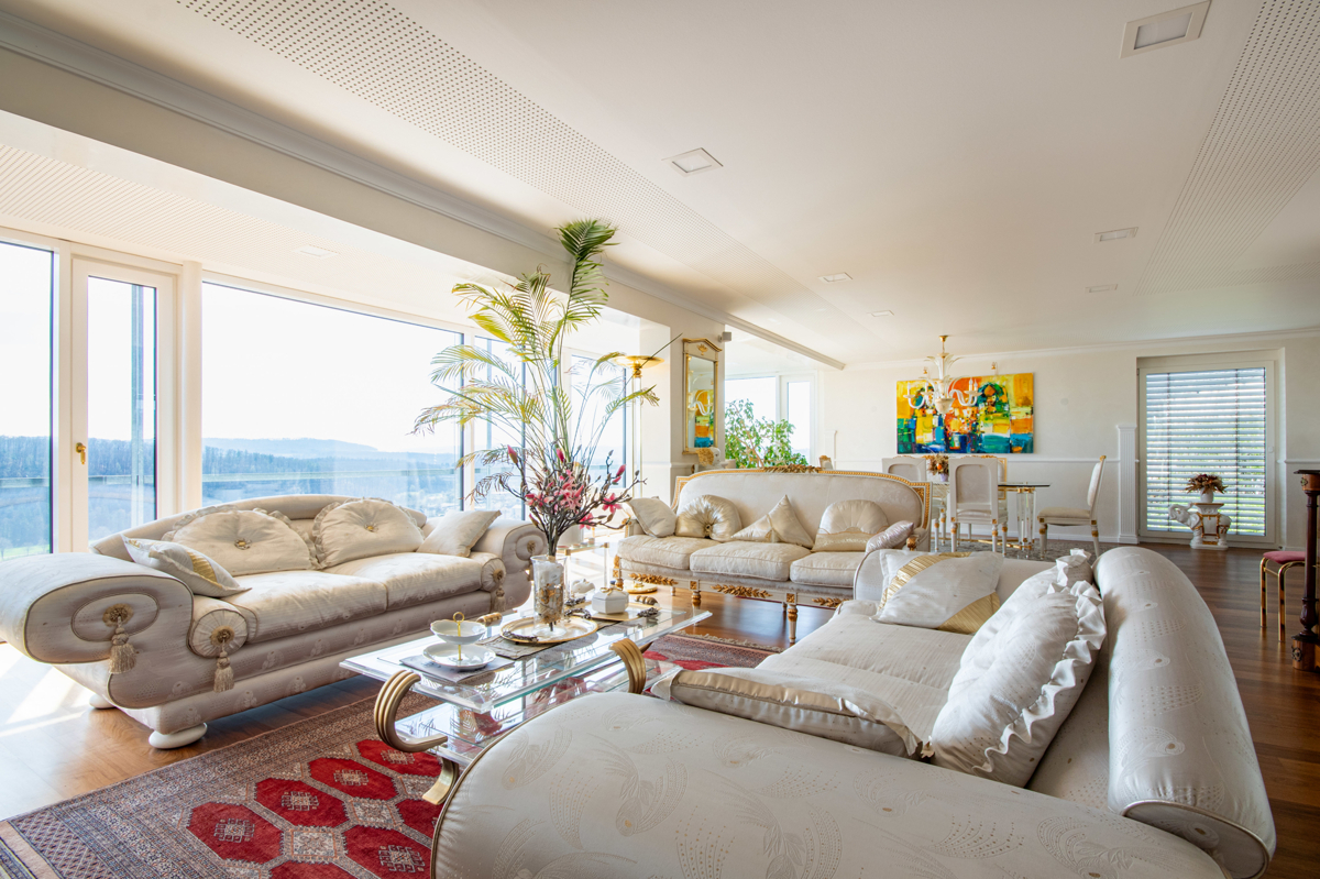 Die nachträgliche Erweiterung des ursprünglichen Grundrisses sowie der Einbau von bodentiefen Fenstern mit Dreifachverglasung sorgen für eine lichtdurchflutete Atmosphäre und eine außergewöhnliche Aussicht über Tiengen.