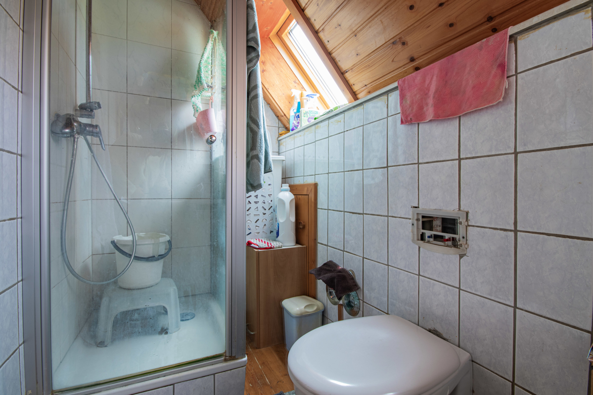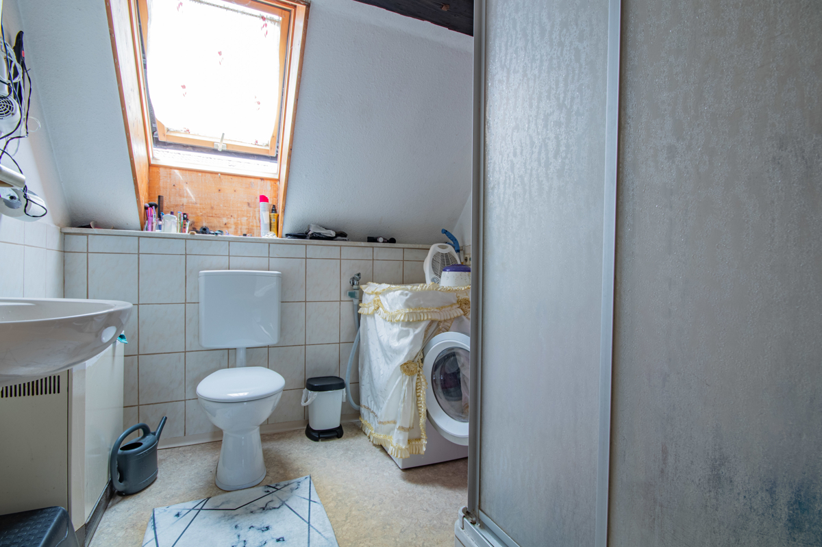 Im Erdgeschoss befindet sich eine großzügige Wohnung mit einem Eingangsbereich, einem Badezimmer aus den 1990er Jahren mit Dusche, Toilette und Waschbecken sowie einem zweiten Bad mit Toilette, Waschbecken und Waschmaschinenanschluss. Die Küche mit integriertem Essbereich führt in das Wohnzimmer mit Schwedenofen. Zwei Schlafzimmer sowie eine Terrasse mit Markise bieten zusätzlichen Komfort. Die Holzfenster in dieser Wohnung wurden 2023 durch moderne, doppelverglaste Elemente ersetzt.