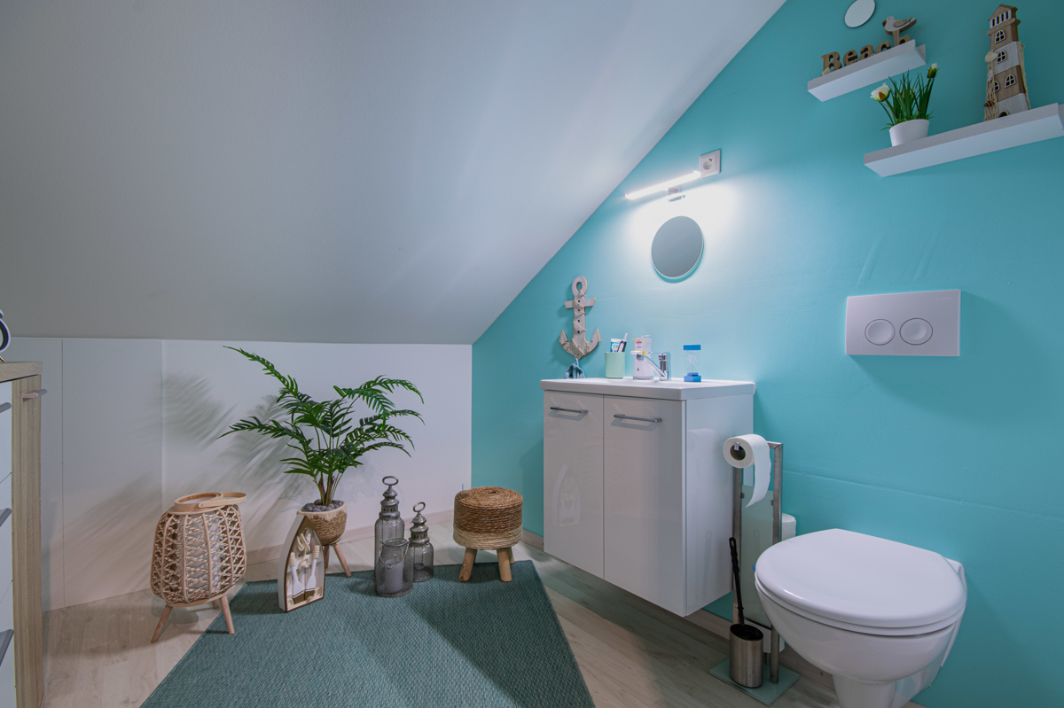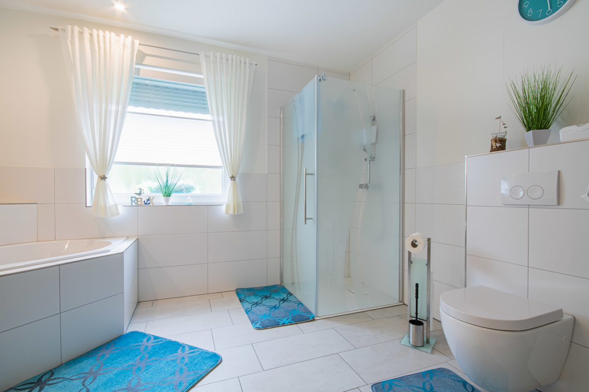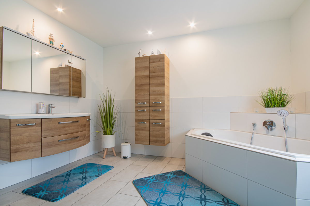 Das große Badezimmer ist hochwertig ausgestattet mit einer Eckbadewanne, einer begehbaren Dusche sowie einem modernen Waschtisch. Ein separates Gäste-WC ergänzt die Etage auf praktische Weise.