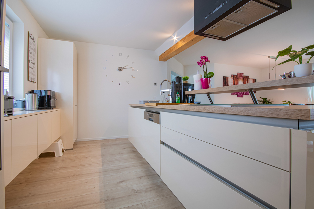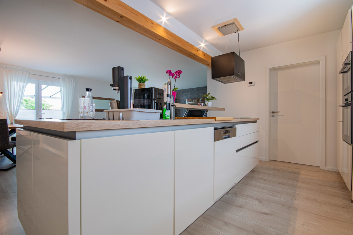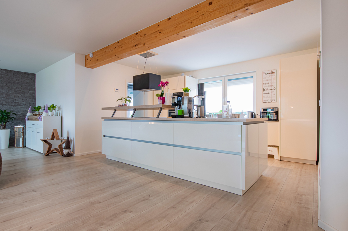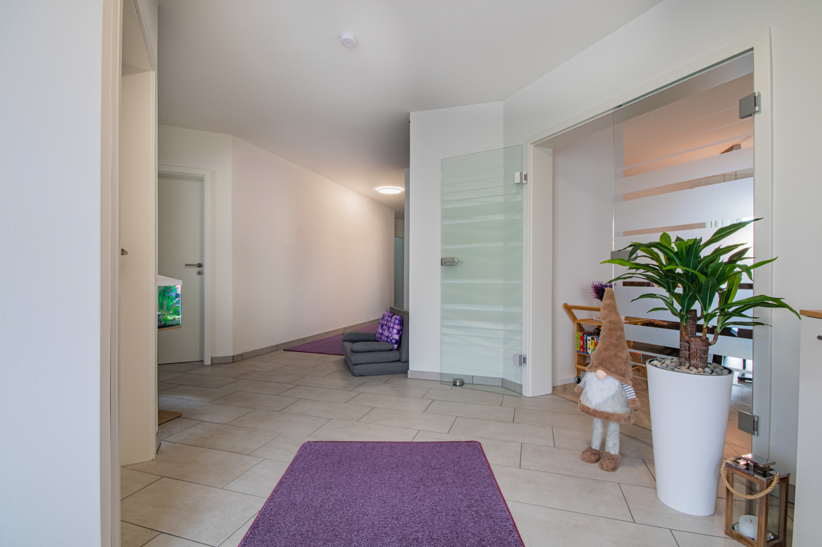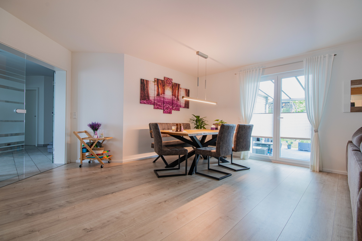 Beim Betreten des Hauses empfängt Sie ein einladender Eingangsbereich, von dem aus Sie direkt in den offenen, hellen Wohn- und Essbereich mit moderner Einbauküche gelangen.