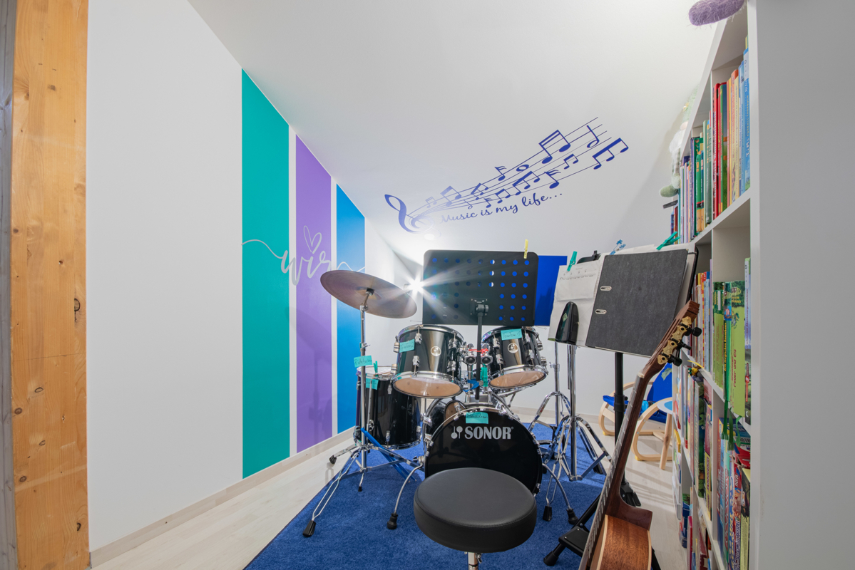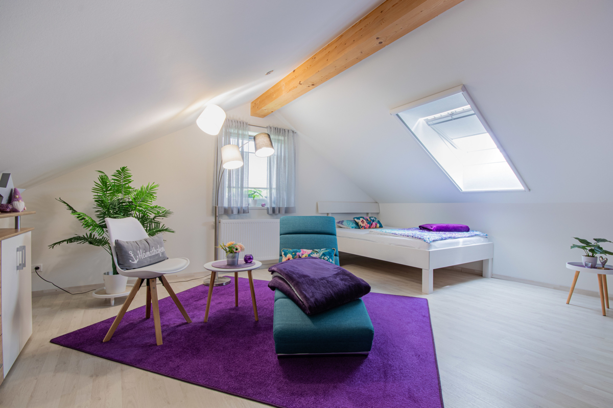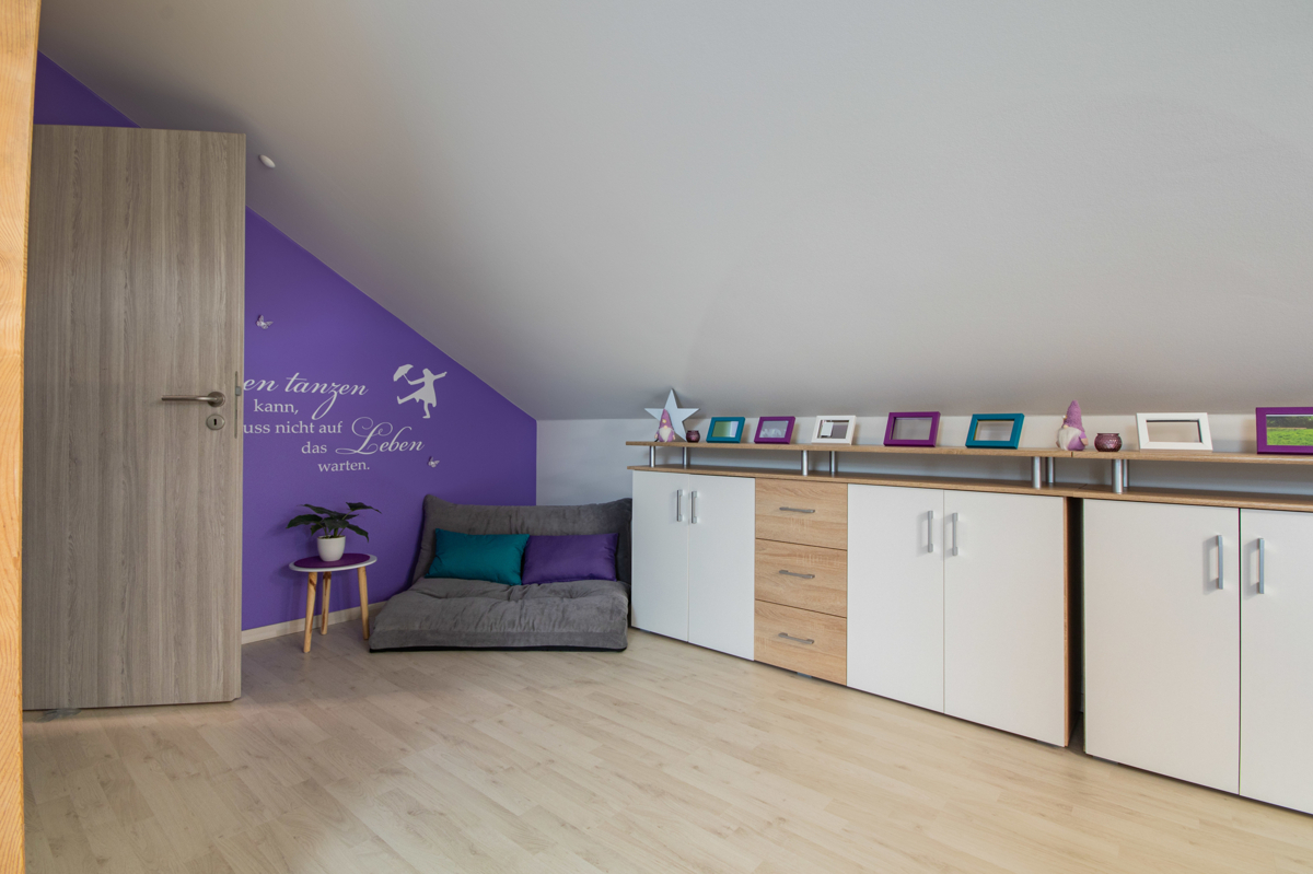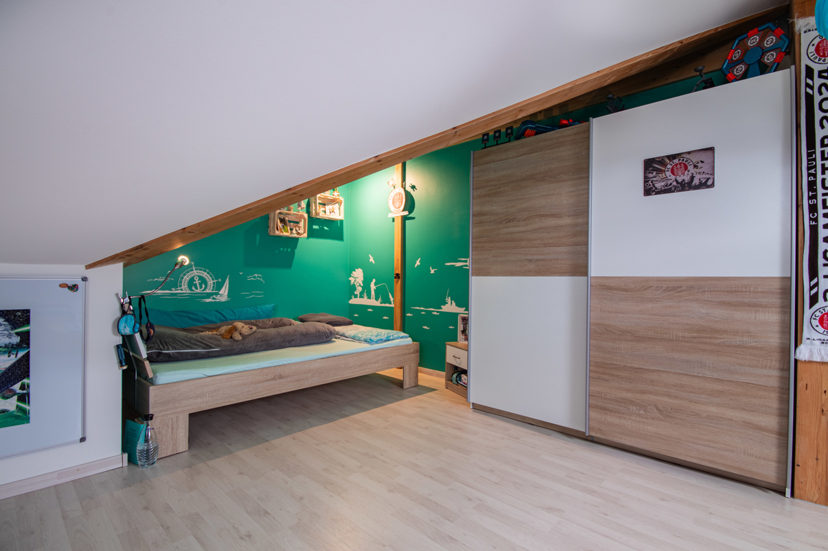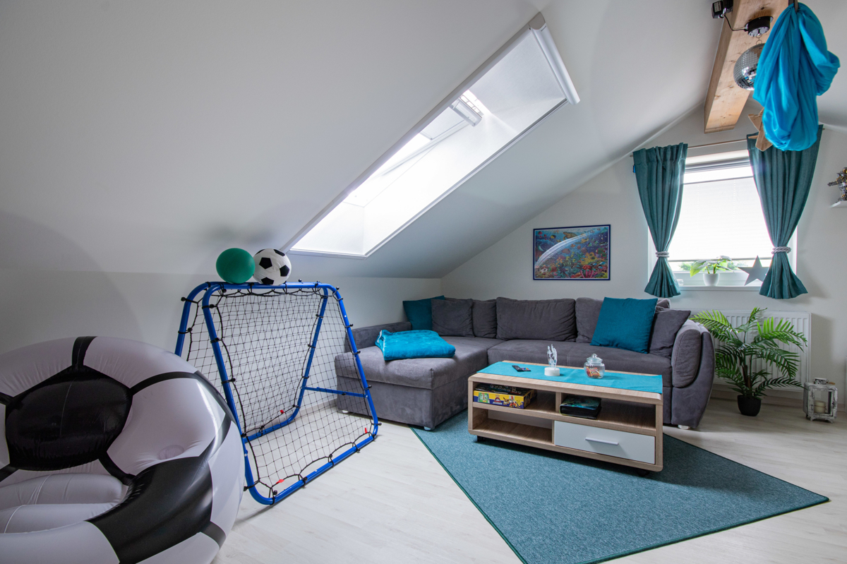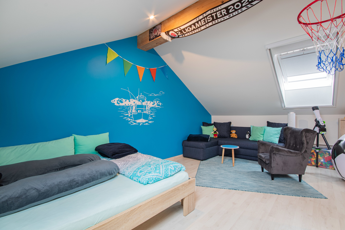 Über eine Wendeltreppe gelangen Sie ins Obergeschoss des Hauses. Hier erwarten Sie drei weitere Schlafzimmer, ein Gäste - WC sowie eine gemütliche Ecke zum musizieren oder anderen Hobbys.
