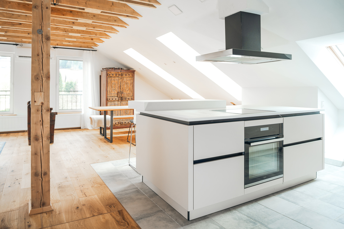 Der private Wohnbereich im Dachgeschoss mit rund 129 m² Wohnfläche ist ein echtes Highlight: eine offene Küche mit Kochinsel, ein lichtdurchfluteter Wohn- und Essbereich unter Sichtgebälk, zwei Kinderzimmer mit jeweils eigenem Bad, ein Elternschlafzimmer mit Badezimmer – und eine Klimaanlage für höchsten Komfort.