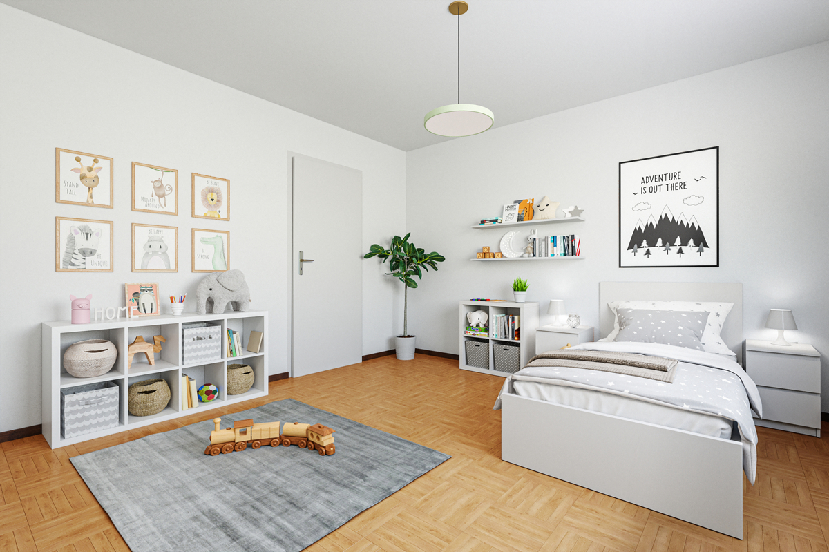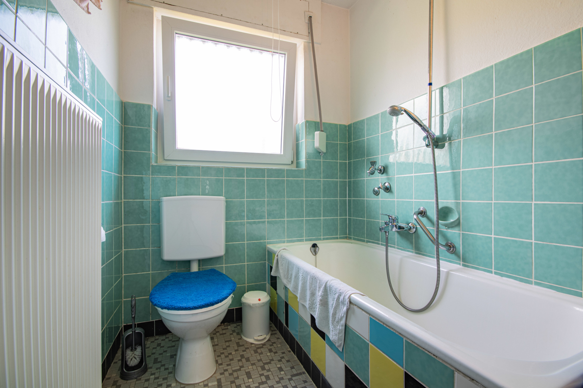 Im Erdgeschoss befinden sich außerdem ein Badezimmer mit Badewanne, Waschbecken und WC, ein Kinderzimmer sowie ein Gästezimmer.