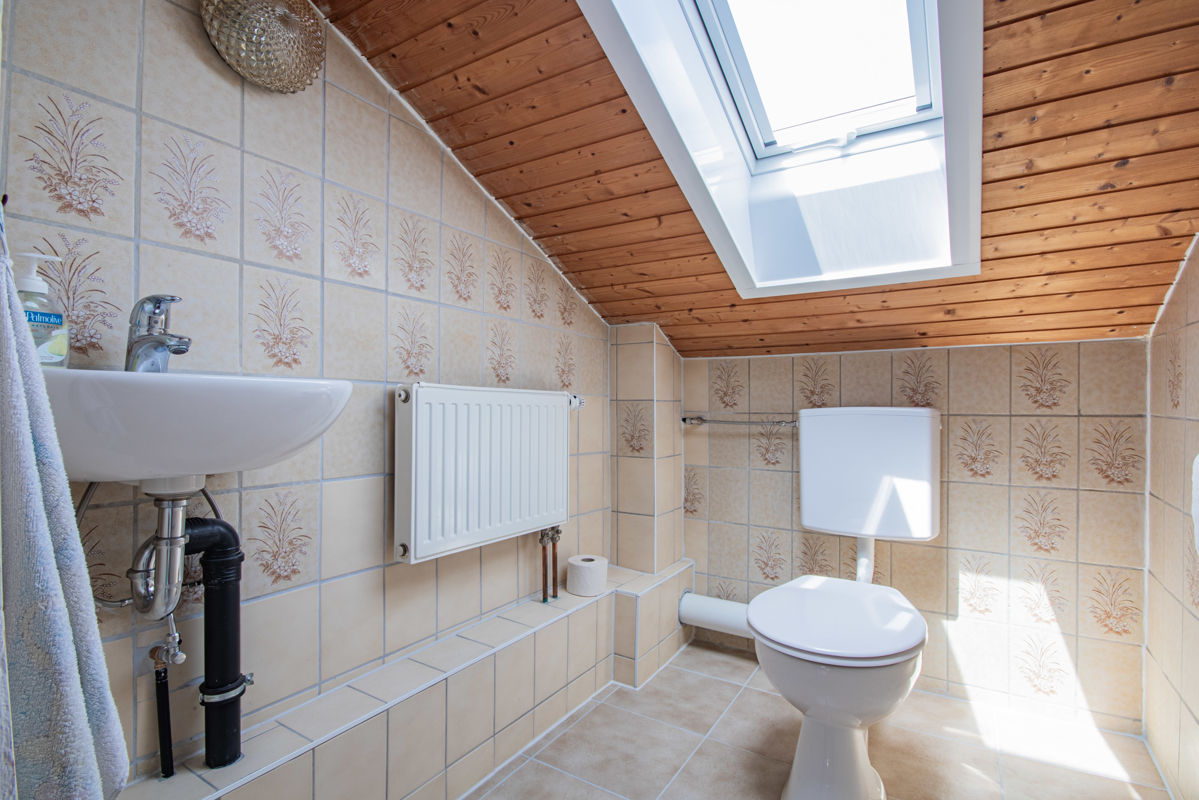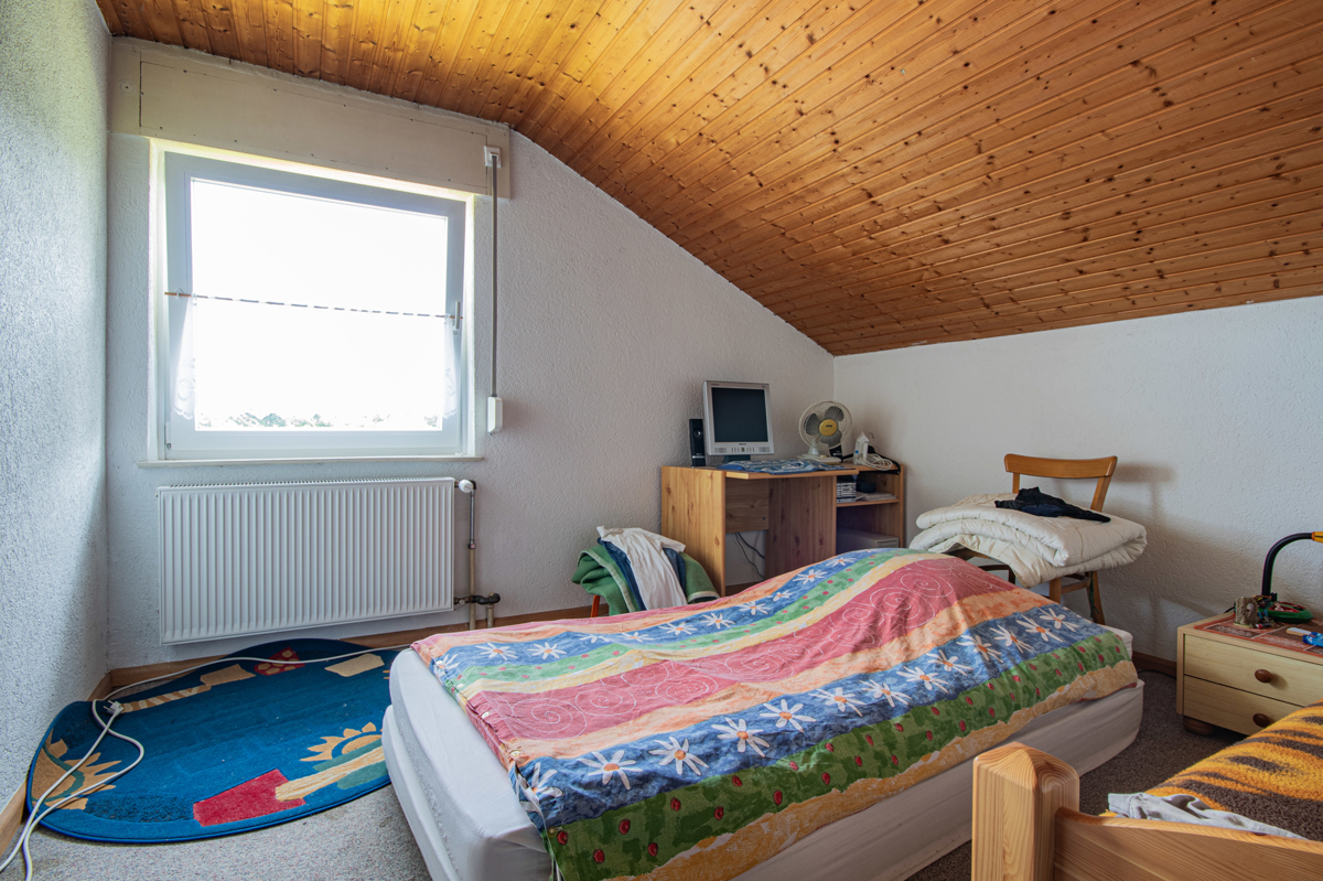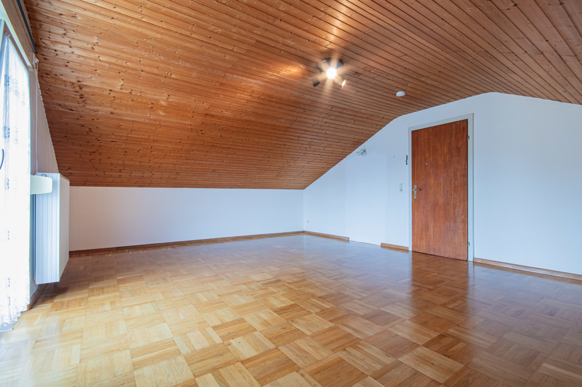 Das ausgebaute Dachgeschoss umfasst ein gemütliches Schlafzimmer, ein großzügiges Zimmer, das als Hobbyraum genutzt werden kann, sowie ein Büro. Zusätzlich steht ein Gäste-WC mit Waschbecken und Toilette zur Verfügung.