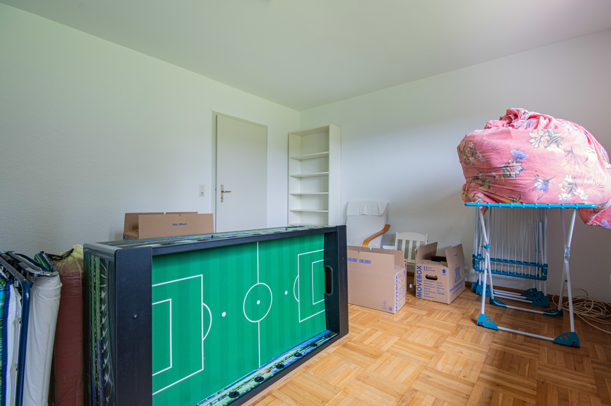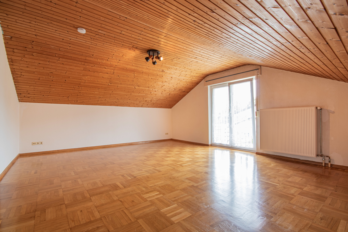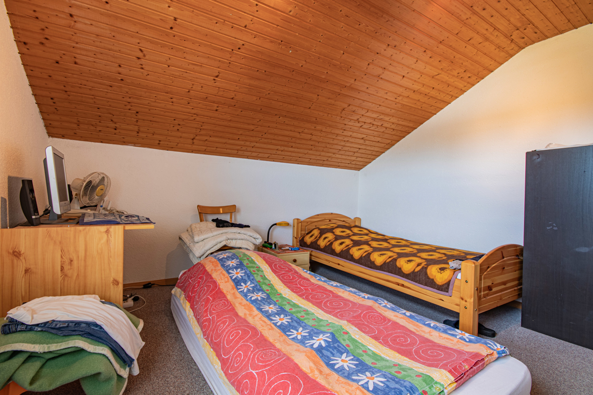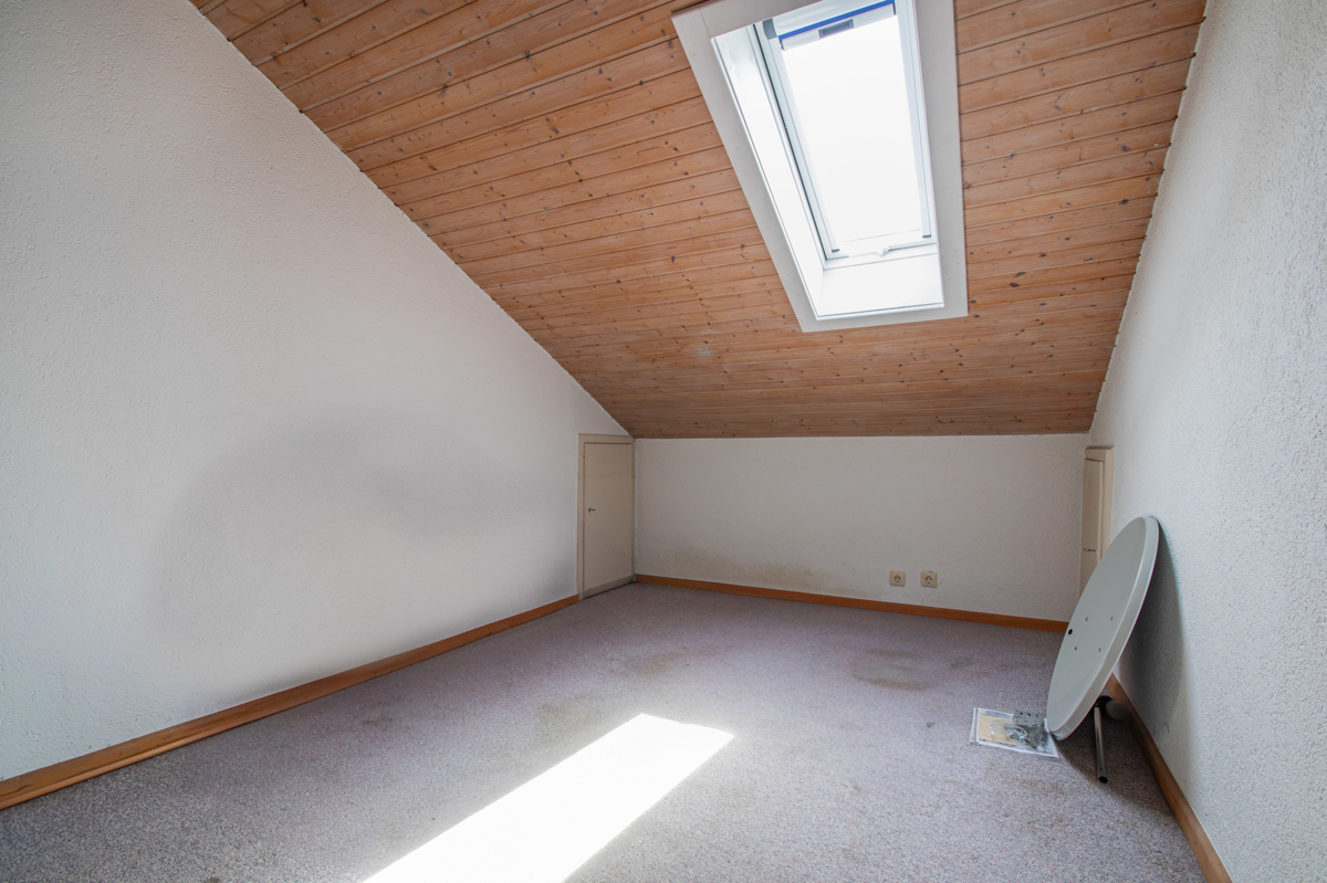Das ausgebaute Dachgeschoss umfasst ein gemütliches Schlafzimmer, ein großzügiges Zimmer, das als Hobbyraum genutzt werden kann, sowie ein Büro. Zusätzlich steht ein Gäste-WC mit Waschbecken und Toilette zur Verfügung.