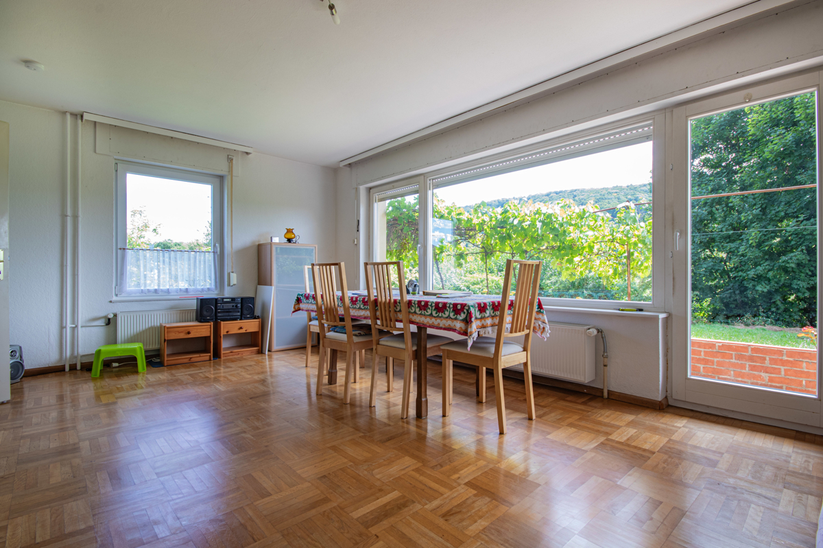 Das große und helle Wohn- Esszimmer überzeugt durch seine freundliche Atmosphäre und zahlreiche Fenster, die viel Tageslicht hereinlassen. Von hier aus besteht ein direkter Zugang zur Terrasse und dem weitläufigen Garten.
