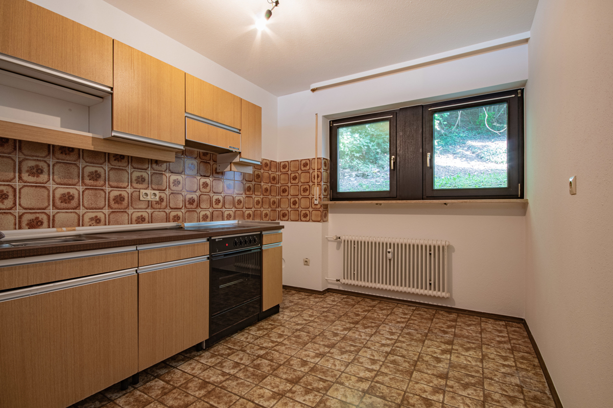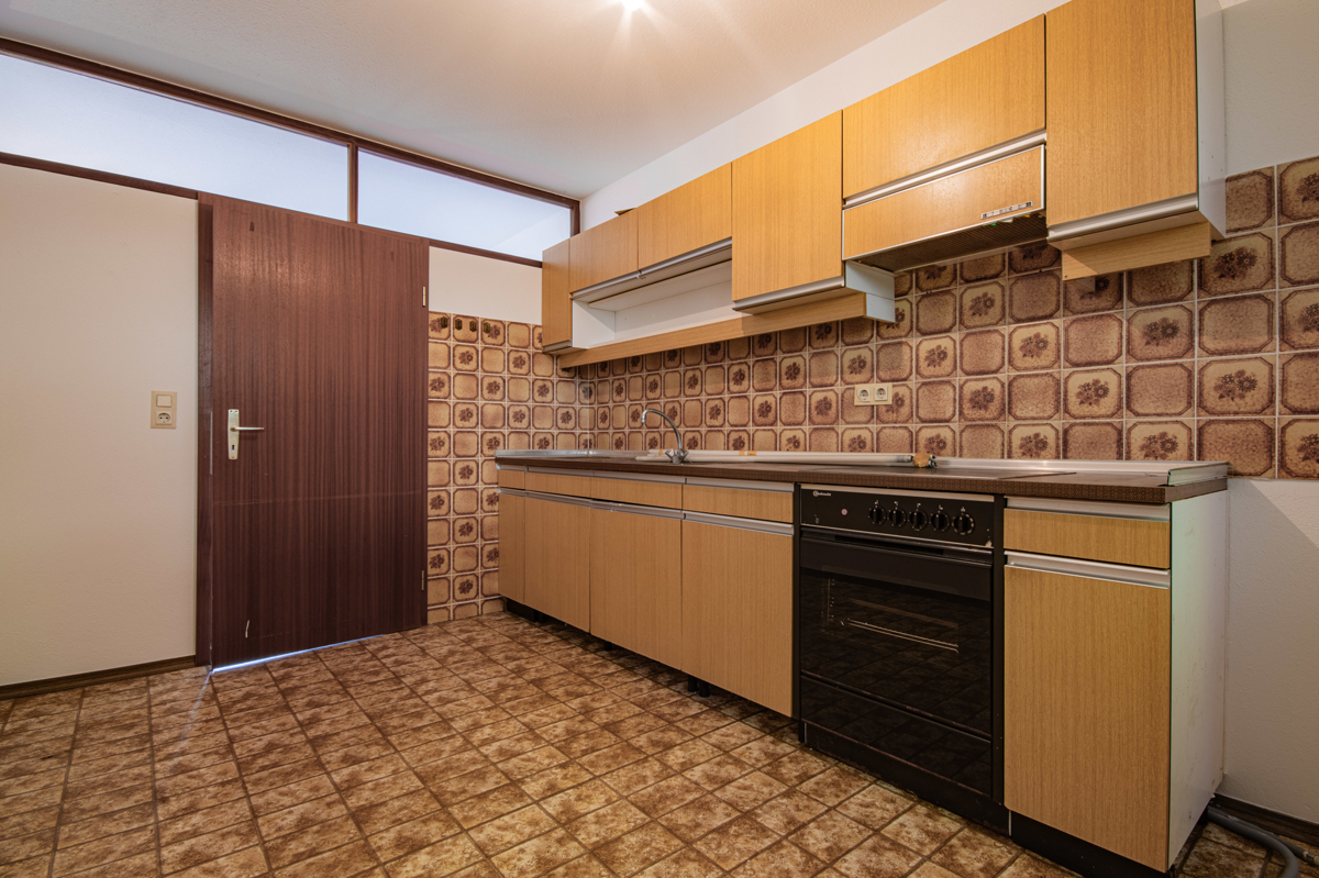 Die angrenzende Küche ist mit einer Einbauküche ausgestattet und bietet zusätzlich Platz für einen kleinen Essbereich.