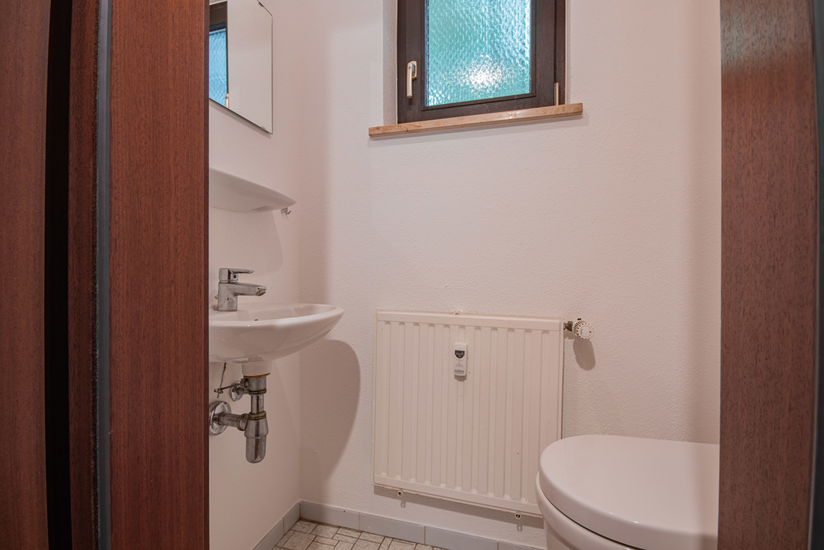 Das Badezimmer ist funktional ausgestattet mit Dusche, Waschbecken und Toilette. Ergänzt wird das Raumangebot durch ein separates Gäste-WC sowie einen kleinen Abstellraum, der praktischen Stauraum bietet.