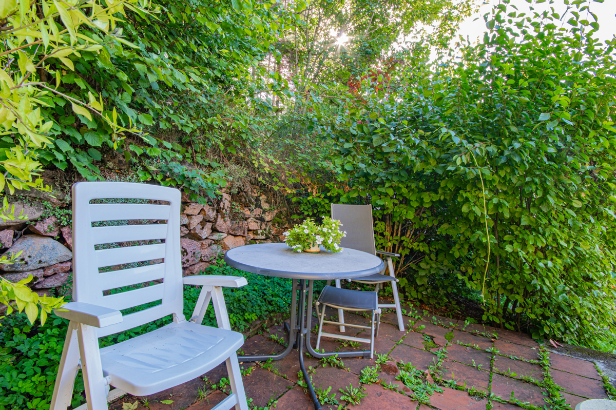 Zum Haus gehört ein separater Freisitz im Grünen sowie ein gegenüberliegendes Grundstück mit biologischem Garten.