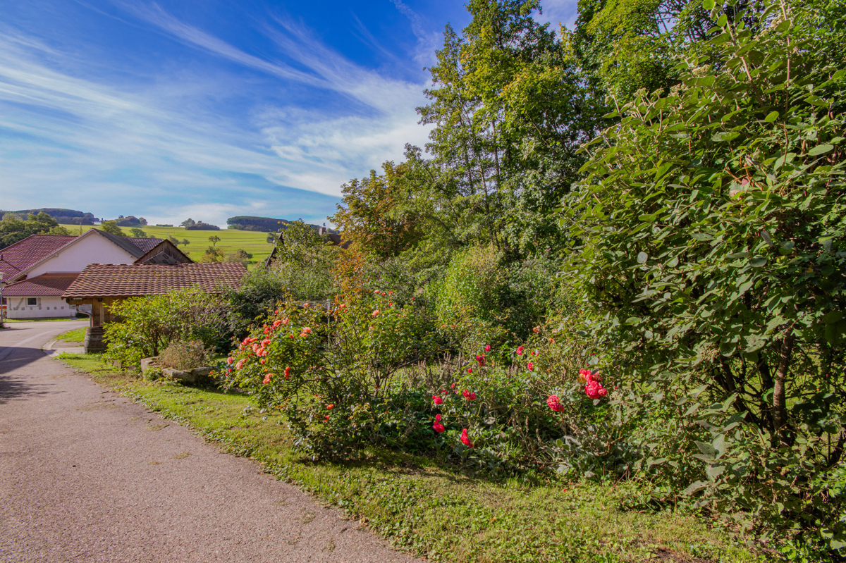 Dort gedeihen eine historische Duftrose und eine bunte Blumenwiese – ein Paradies für Bienen und Naturliebhaber. Ein kleiner Bach, der am Grundstück entlangfließt, verstärkt den idyllischen Charakter.