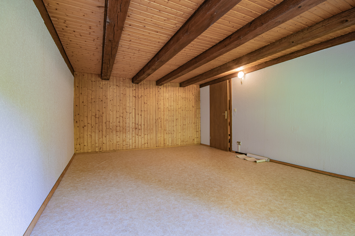 Das Obergeschoss bietet ein Schlafzimmer mit Durchgang zu einem weiteren Zimmer, das sich ideal als Ankleide eignet. Darüber hinaus finden Sie hier eine weitere Küche mit Einbauküche sowie ein Badezimmer mit Dusche, Waschbecken und WC.