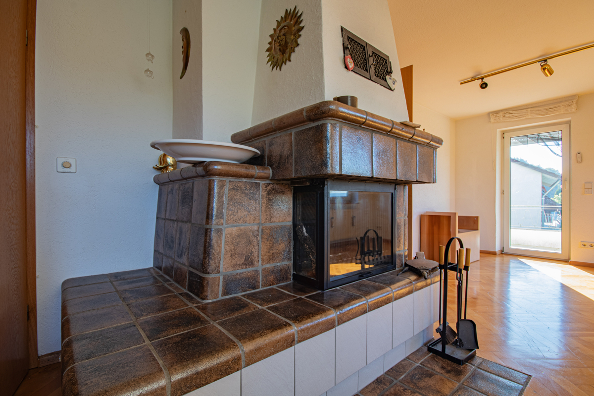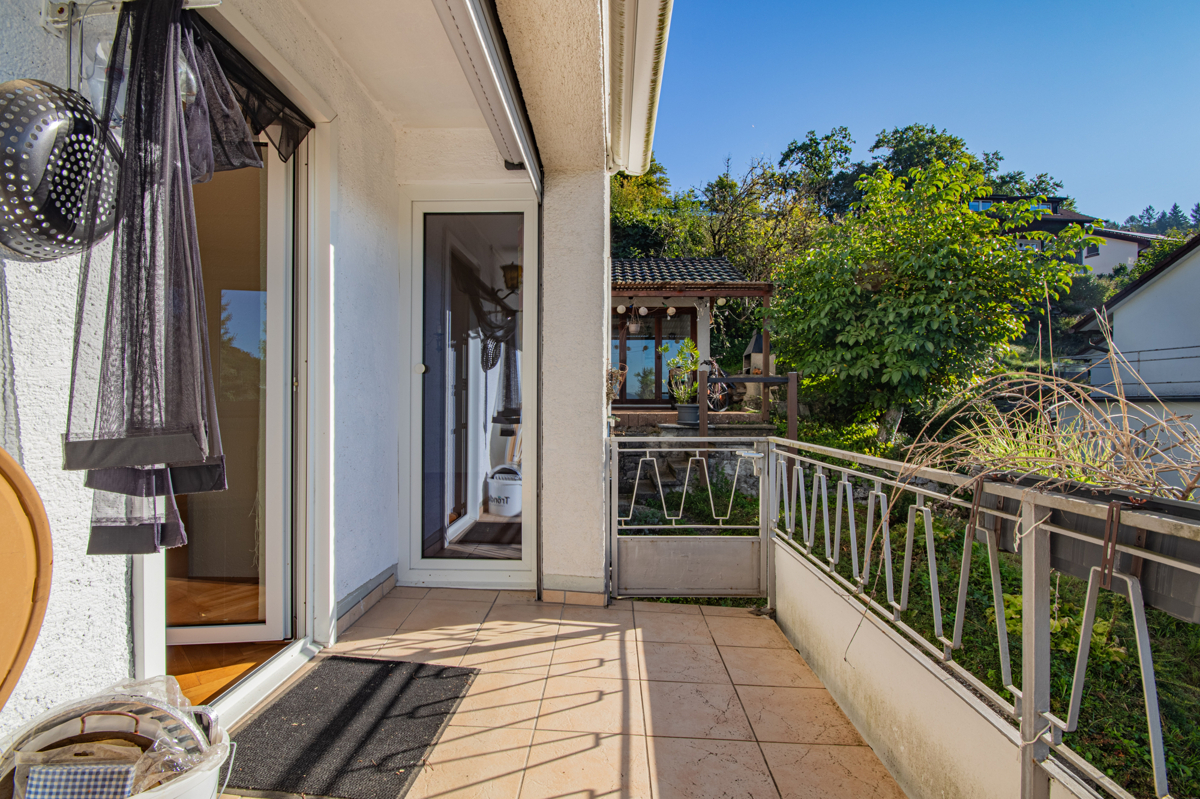 Über eine Treppe gelangen Sie zum Eingangsbereich des Hauses. Im Erdgeschoss erwartet Sie ein großzügiger Wohn- und Essbereich mit gemütlichem Kaminofen, von dem aus Sie direkt auf den sonnigen Balkon treten können. Von hier genießen Sie einen traumhaften Blick über ganz Waldshut. Auf derselben Etage befindet sich zudem ein Gästezimmer mit Zugang zum Balkon, eine Küche mit moderner Einbauküche sowie ein Gäste-WC mit Dusche.