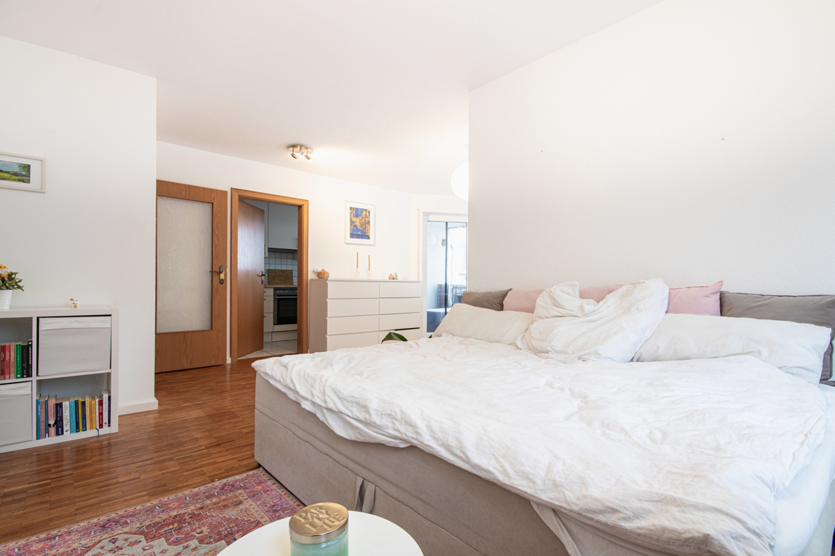 Der großzügige Wohn- und Essbereich bildet das Herzstück der Wohnung. Vom Wohnzimmer gelangt man auf den Balkon, der eine schöne Aussicht auf die grüne Umgebung bietet. Die separate, moderne Küche bietet mit einem zusätzlichen Abstellraum weiteren Platz für Stauraum. Das Schlafzimmer bietet ausreichend Platz für ein Doppelbett und einen Kleiderschrank. Das Badezimmer ist großzügig und modern ausgestattet.