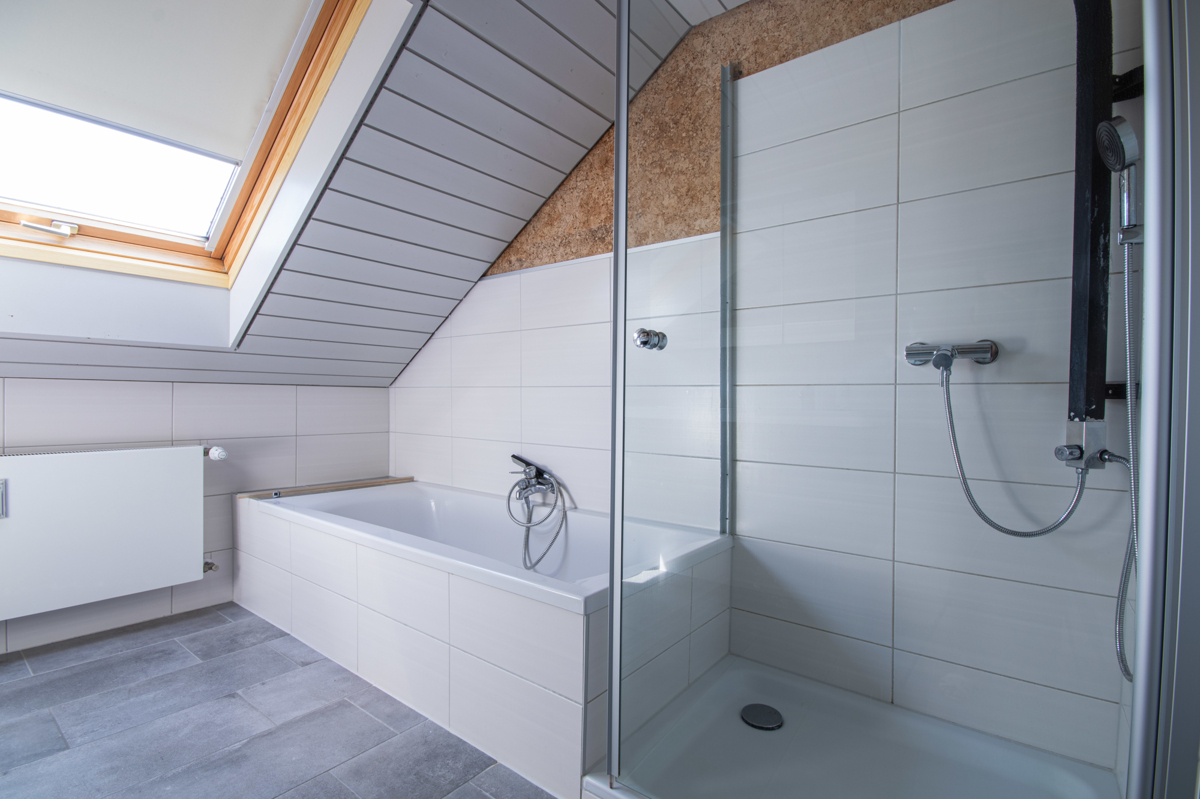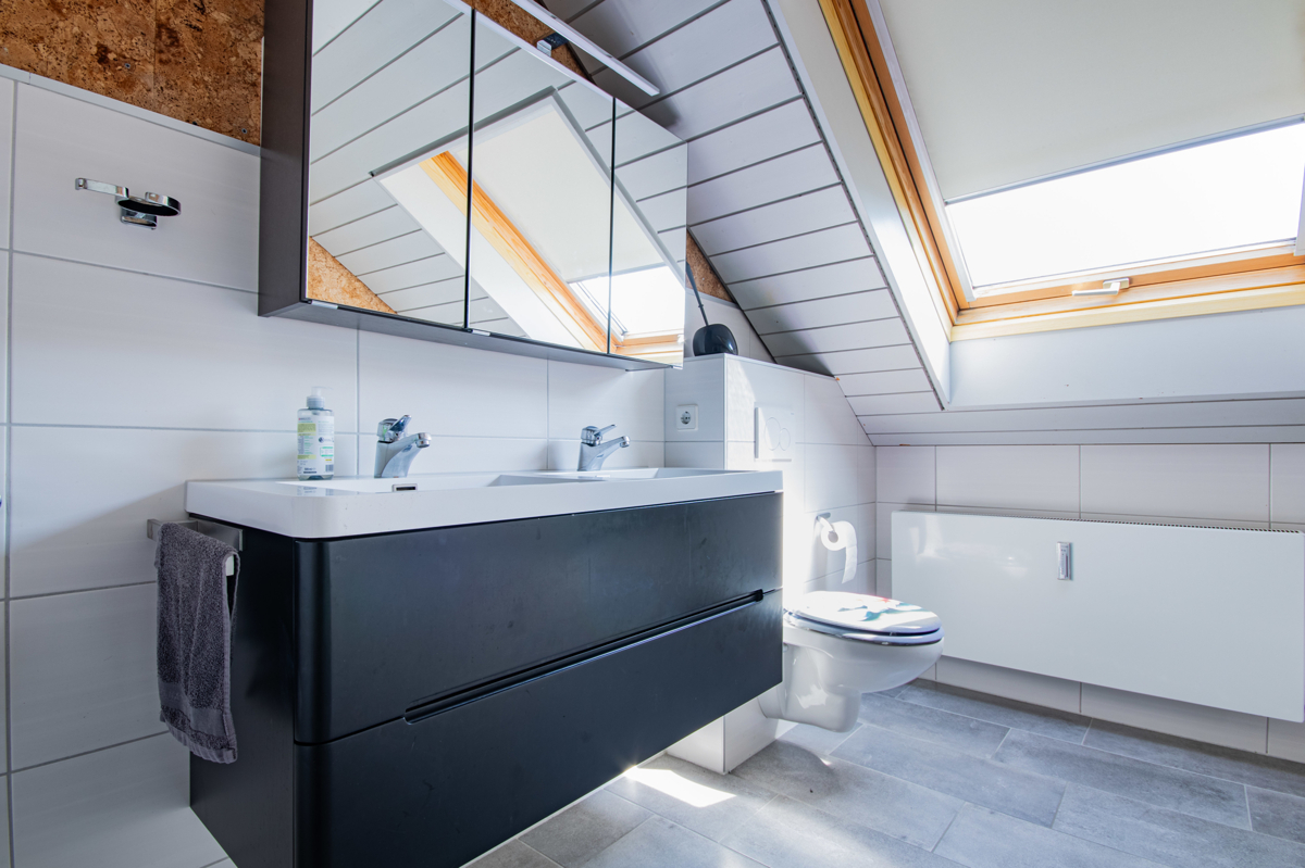 Das Badezimmer der Wohnung verfügt über eine Dusche, ein Doppelwaschbecken, eine Badewanne sowie eine Toilette. Ein zusätzliches Gäste-WC sorgt für weiteren Komfort.